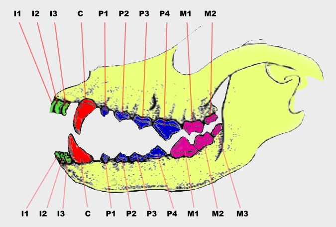 Das Milchgebiss der Hunde hat 28 Zähne. Der P1 und die hinteren Mahlzähne besitzen keine Milchzahnvorgänger. Die Zahnarten werden im Milchgebiss meist mit kleinen Buchstaben gekennzeichnet.