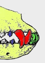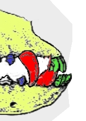 r. | => rechte Seite | o. | => Oberkiefer | + | => Zahn doppelt |